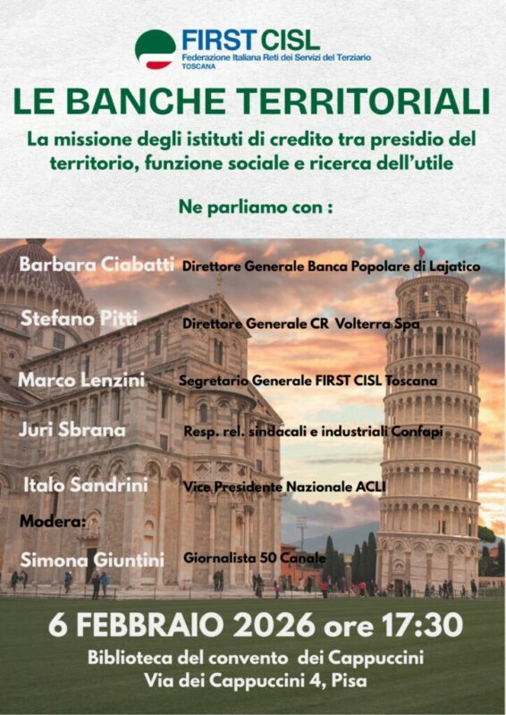 “Le banche territoriali. La missione degli istituti di credito tra presidio del territorio, funzione sociale e ricerca dell’utile”, è questo il titolo della tavola rotonda organizzata da First Cisl Toscana che si terrà Venerdì 6 febbraio 2026 a Pisa presso la Biblioteca del convento dei Cappuccini, Via dei Cappuccini 4.